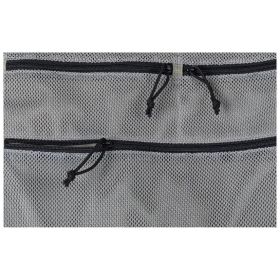 • The main compartment has three mesh zippered pockets, a padded laptop/tablet sleeve, and hook/loop closure slip pockets