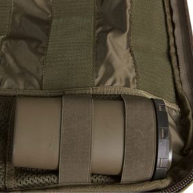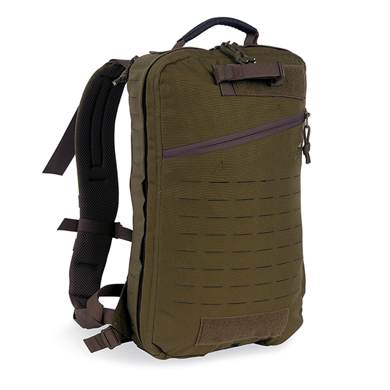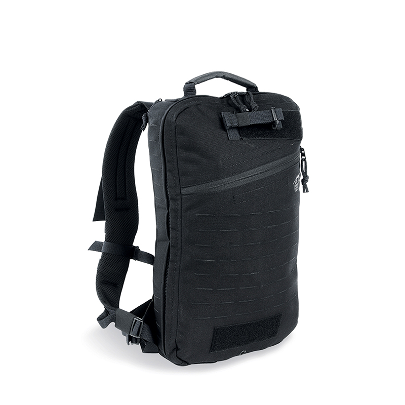 Flat Medic backpack with intelligent, clearly laid-out interior. The MOLLE system on the front and sides is laser cut. The lightweight padded shoulder straps can be detached and kept in a hook-and-loop fastening pocket on the back, and the rucksack comes with webbing so it can be adapted to a panel carrier. Stowable carrying handles for high-speed transportation in an emergency.