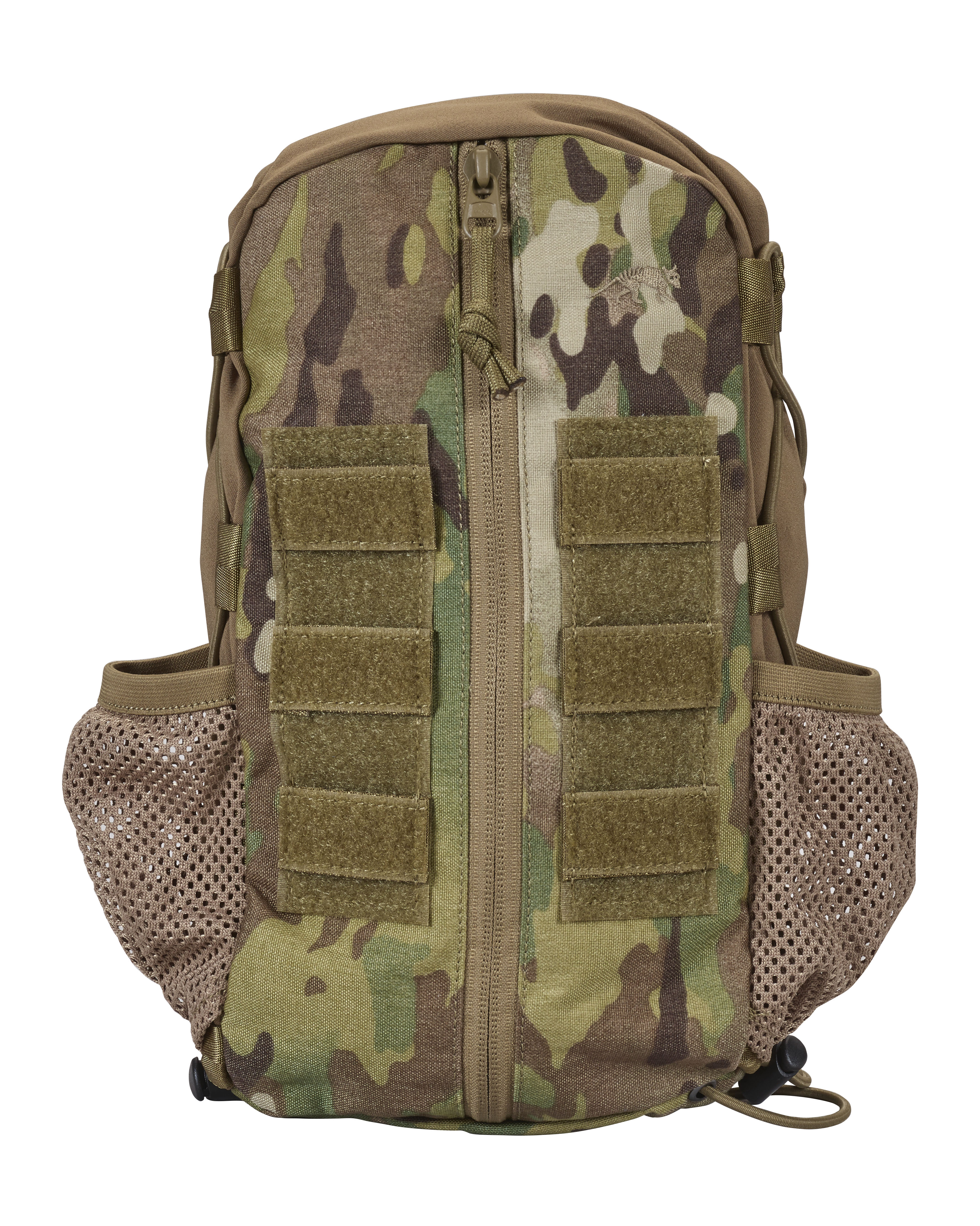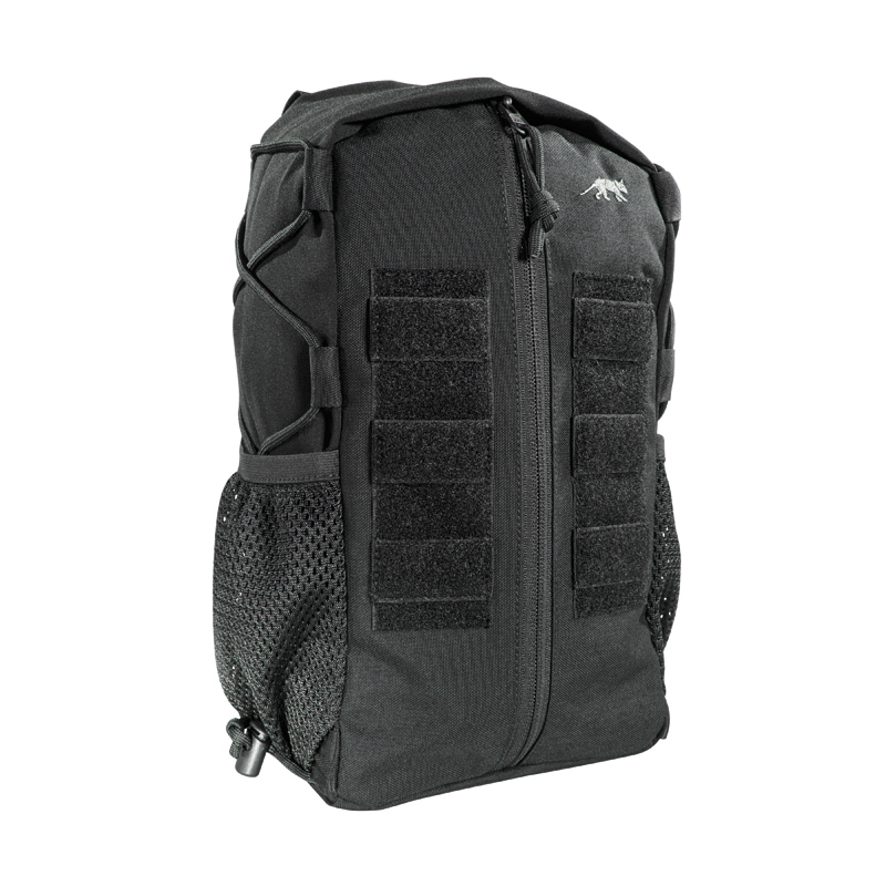 Lightweight, compressible multi-purpose pouch with elastic side panels. The TT Tac Pouch 11 has a volume of 5 liters and can be attached to plate carriers and backpacks. The center zipper allows quick access. The functional interior layout of the main compartment has a MOLLE hook-and-loop, and a bungee cord can be used, for example, for medical equipment. The pouch also has side pockets made of mesh fabric, e.g., for magazines, and Molle hook-and-loop on the front. The entire system can be compressed with a bungee cord. The pouch is also equipped with a drinking system preparation and the corresponding tube exit.