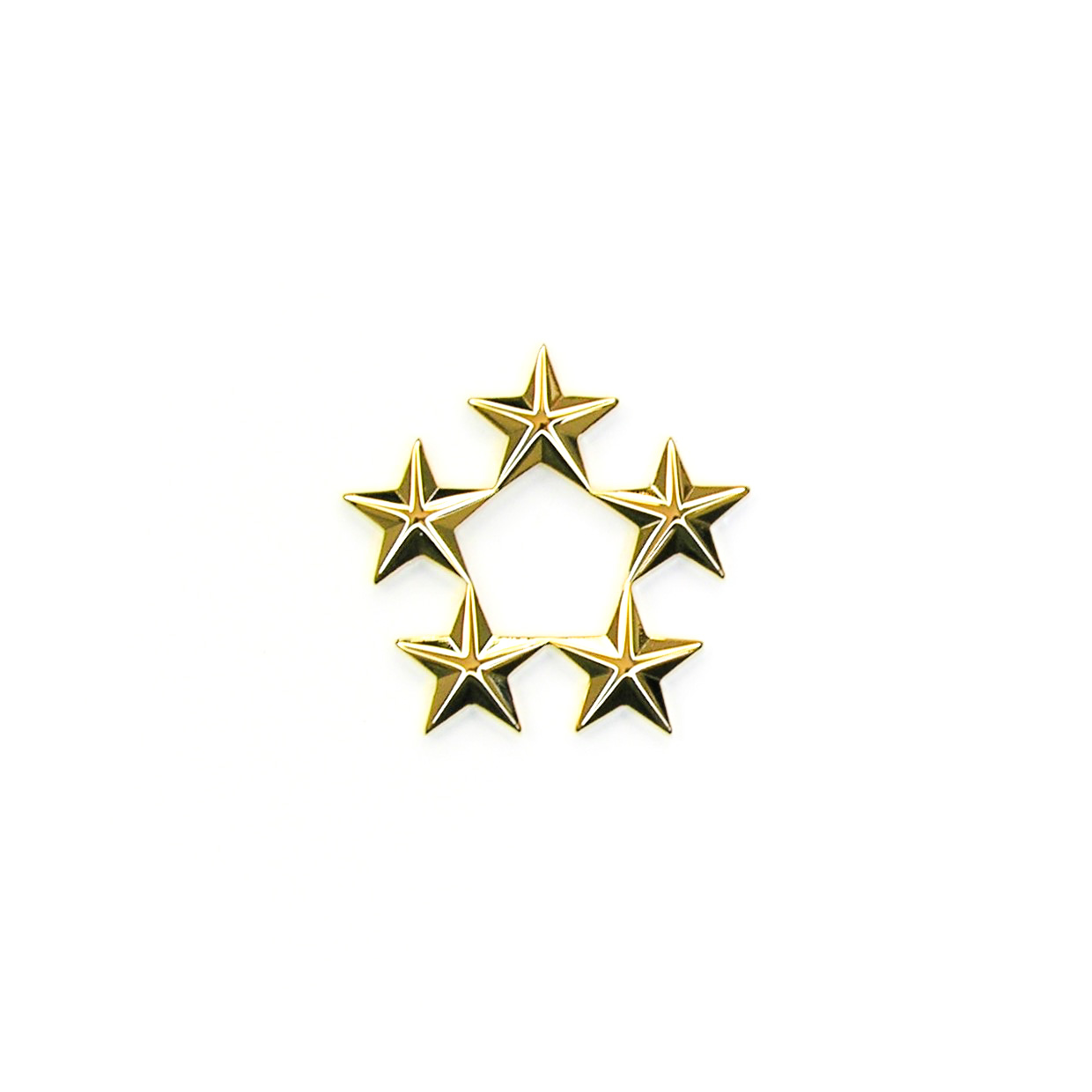 ELC Accessories' highest-quality Metal Rank Insignia. 5-Star Cluster Collar Brass is made of solid brass and lacquered to prevent tarnishing. Military-Spec quality. Pins are guaranteed not to fall off. Sold by the Pair. Made in the USA.