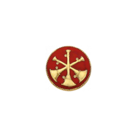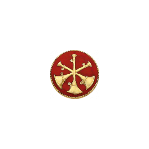 American-made Fire Department Collar Brass: 15/16" RED/GOLD three crossed bugles. Manufactured to military specification from solid brass with pins that will not break off. Lacquered to prevent tarnishing.