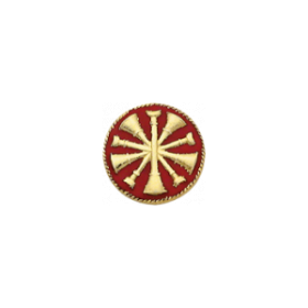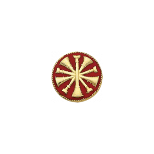 American-made Fire Department Collar Brass: 15/16" RED/GOLD five crossed bugles. Manufactured to military specification from solid brass with pins that will not break off. Lacquered to prevent tarnishing.