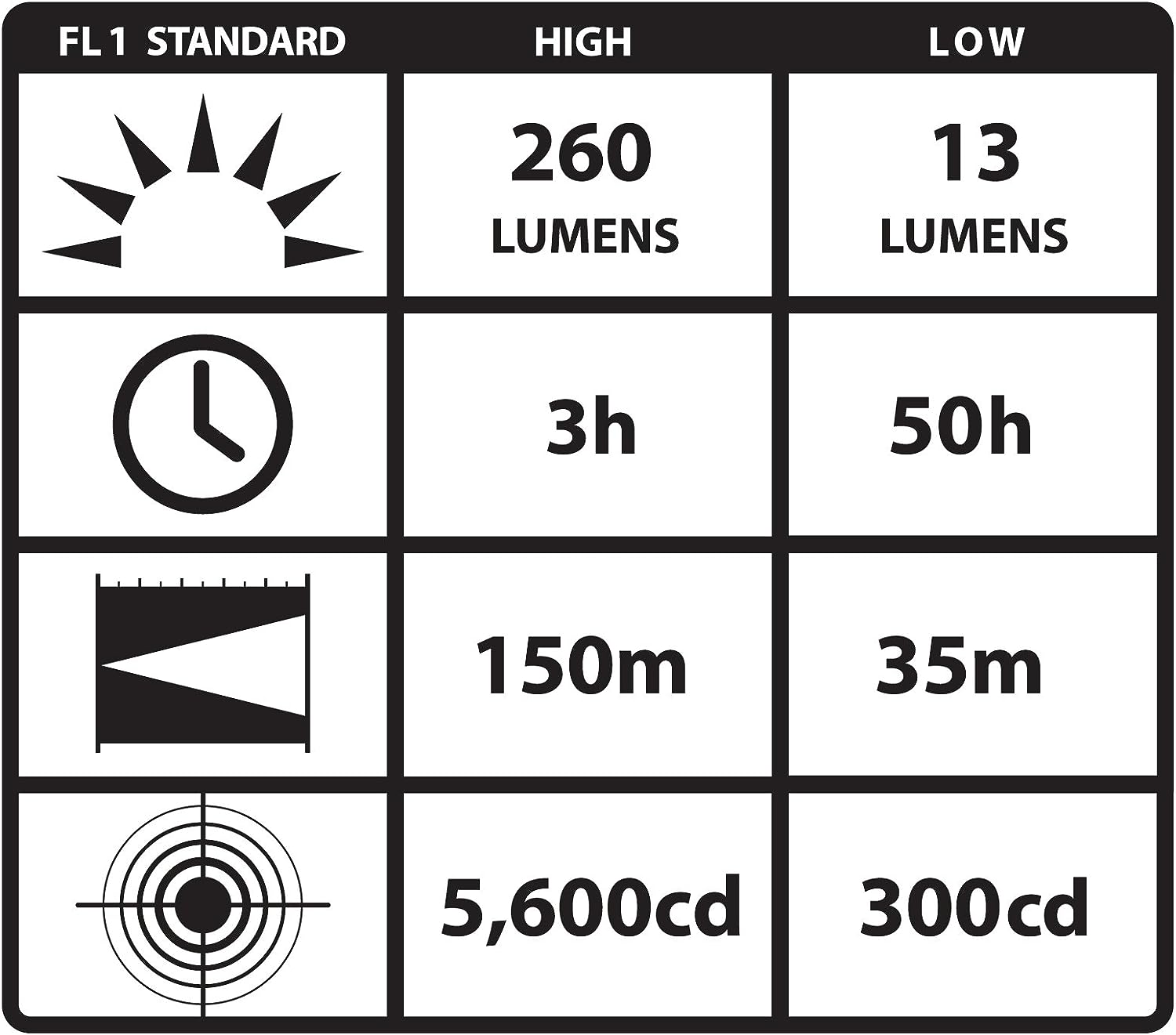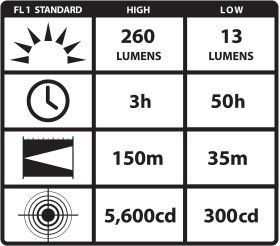 - High for bright light: 350 lumens; 6,300 candela; 159m beam; runs 3.25 hours