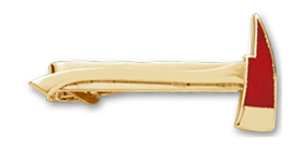 This gold tie clip is designed to resemble a firefighter's axe. The axe head is gold with the striking face of the blade painted a bright red.