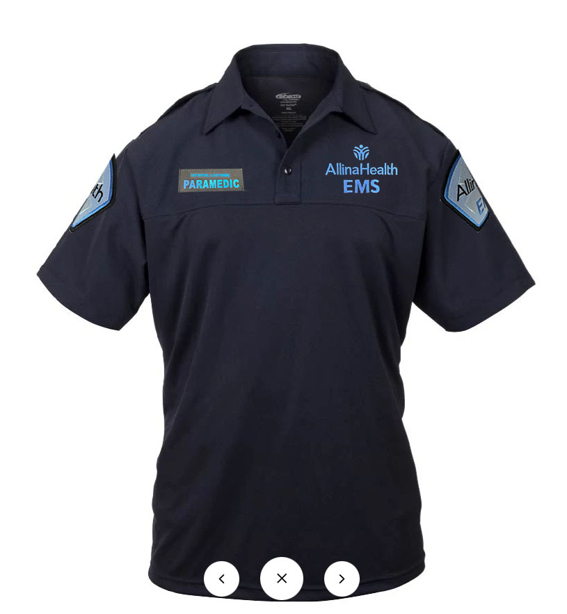 Left chest: Allina Health EMS logo embroidered 1-color Blue 1029