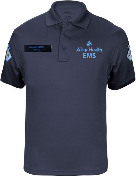 Left chest: Allina Health EMS logo embroidered 1-color Blue 1029