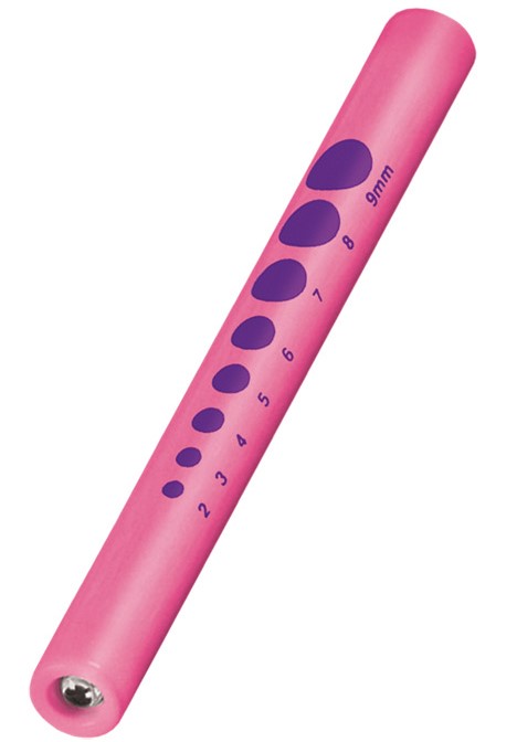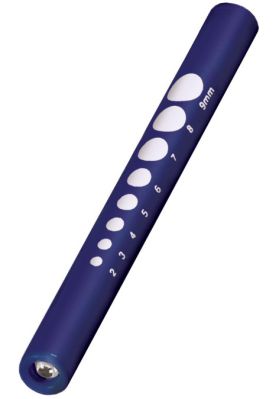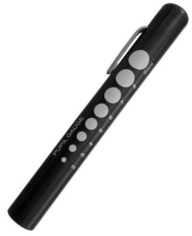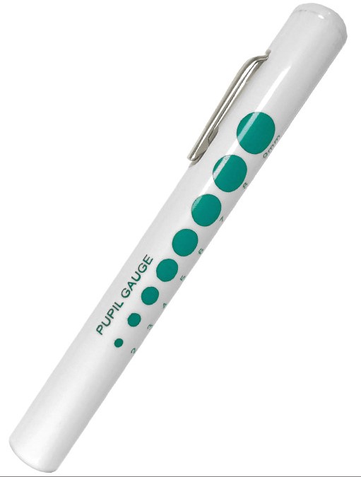 Disposable pupil gauge penlight with clip-activated illumination. Features plastic construction, pupil gauge imprint, and soft LED illumination.