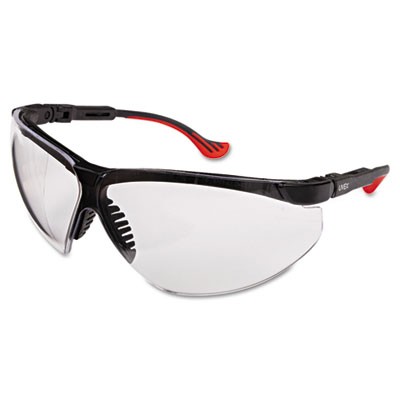 The high-performance protection offered by the UVEX Genesis eyewear features a wrap-around 9-base uni-lens style, providing uncompromised peripheral vision and superior coverage. The lenses are available with Dura-extreme dual coating technology, combining Uvextreme anti-fog on the interior and Ultra-dura anti-scratch on the exterior for three times longer lens life. These eyewear provide the highest available impact protection, meeting ANSI Z87.1-2010 certification and passing the military V0 ballistic impact test, which protects against impact energies seven times higher than ANSI requirements. They are also CSA Z94.3 certified. The soft elastomer browguard diffuses and deflects impact for superior comfort and fit while offering comfort at all contact points. The smooth, flexible fingers on the nose piece adjust to almost any nasal profile to reduce slippage, and the adjustable temple length and lens inclination allow for a customizable fit.