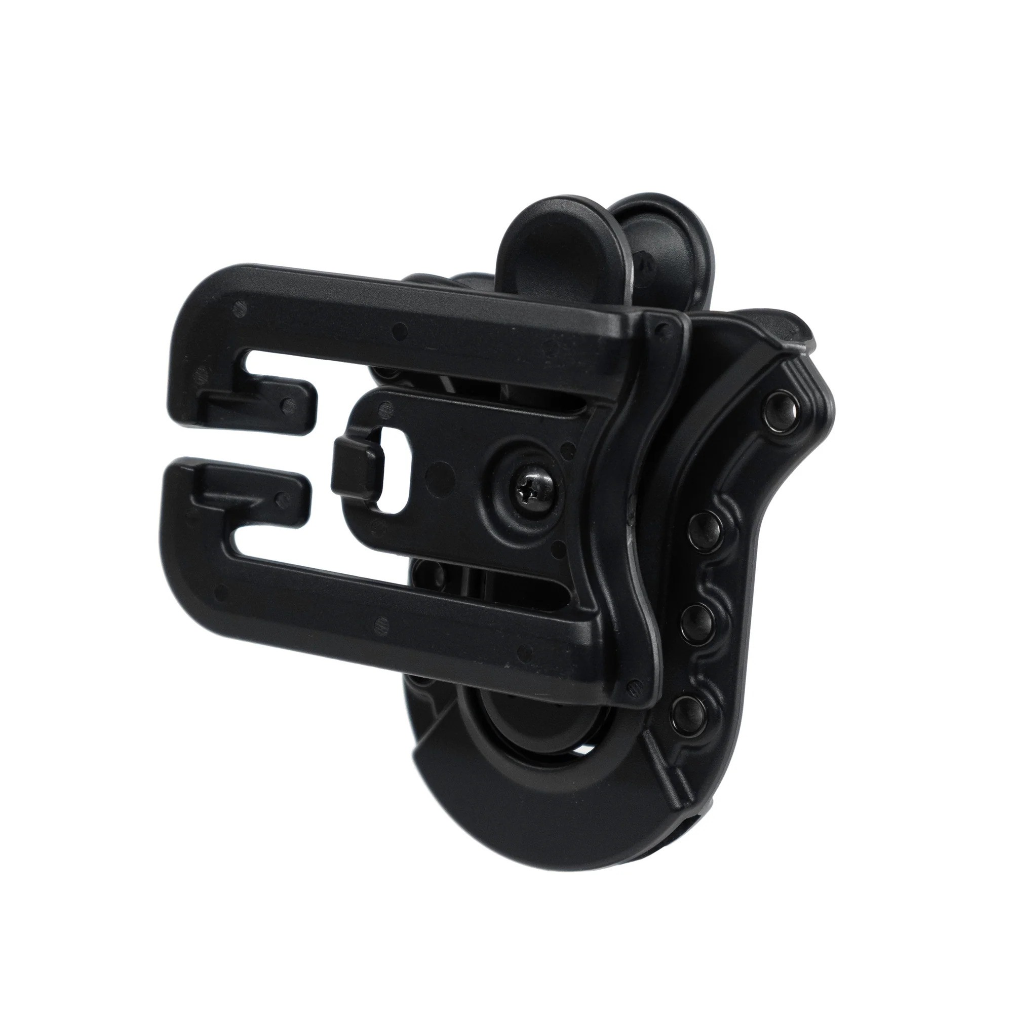 - MOLLE Compatible adjustable belt clip secured holster in place and offers flexible orientation of holster with simple Philips head screw.