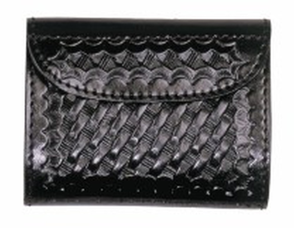 Basketweave leather design. Two pouches/pockets for two sets of latex gloves. Hook and loop closure, 4" wide and 3" high. Fits horizontally, as shown on a 2-1/4" duty belt.