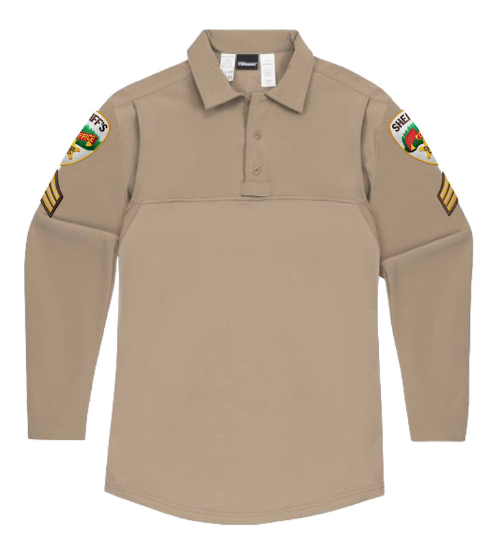 Left shoulder: Cass County Sheriff patch with Aspen Mills's Tan/Gold border Chevrons on Brown twill