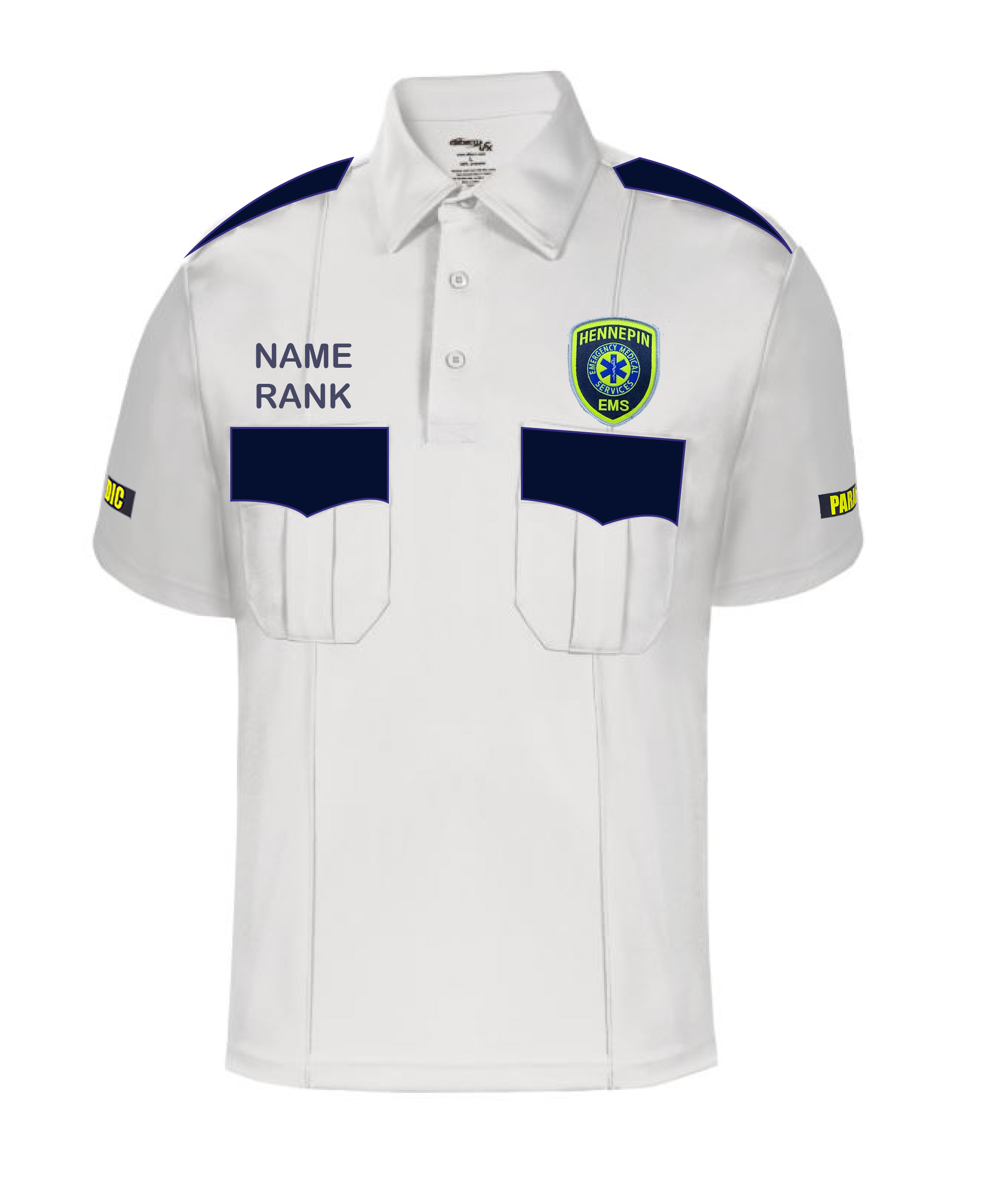 Back: ColorReflect navy Line 1 = HENNEPIN Line 2 = EMS Line 3 = RANK 8”x4¾”
