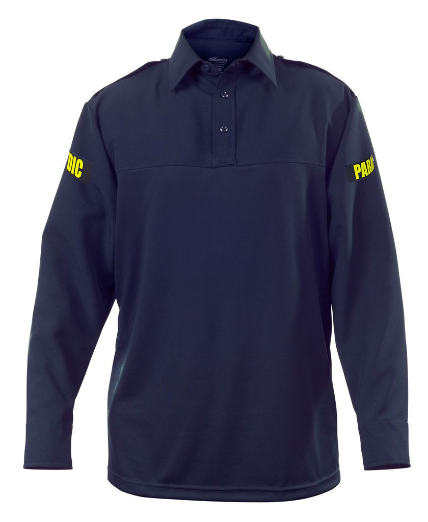 Right shoulder = Reflection Decoration hiviz yellow PARAMEDIC 4”x 1”, on matching navy panel