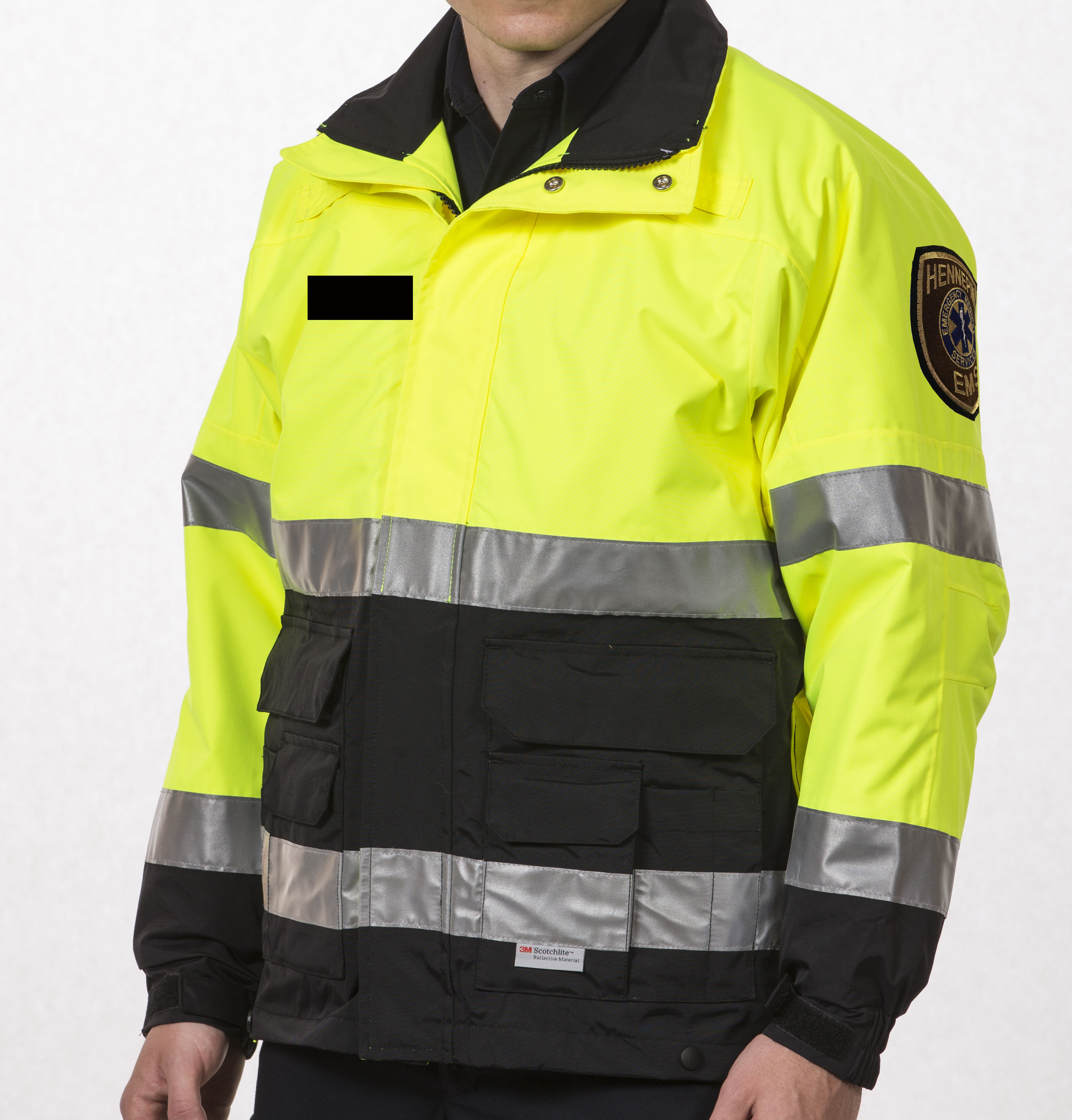 Left shoulder: Hennepin EMS patch, hi-viz yellow/silver color scheme