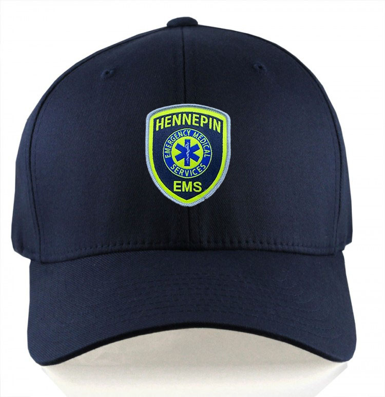 Front: 2 3/8” high Hennepin EMS cap patch, hi-viz yellow / silver color scheme