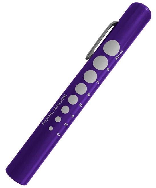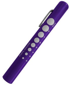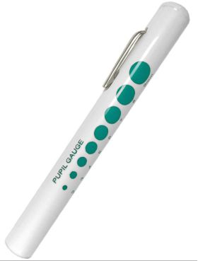 Disposable pupil gauge penlight with clip-activated illumination. Features plastic construction, pupil gauge imprint, and soft LED illumination.