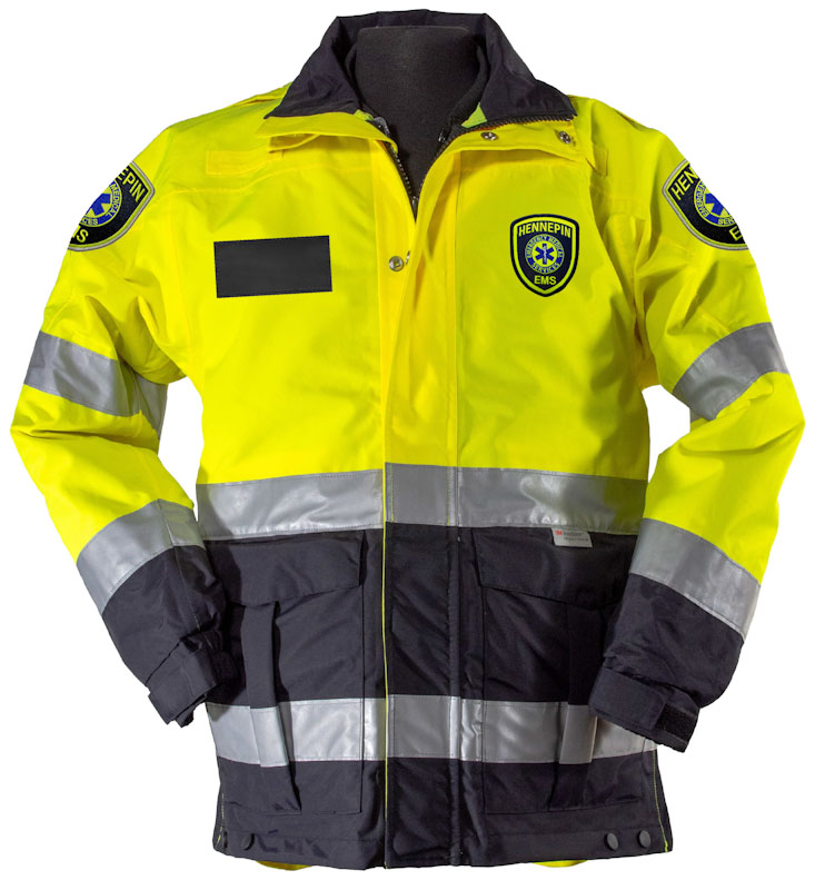 Left shoulder: Hennepin EMS patch, hi-viz yellow/silver color scheme