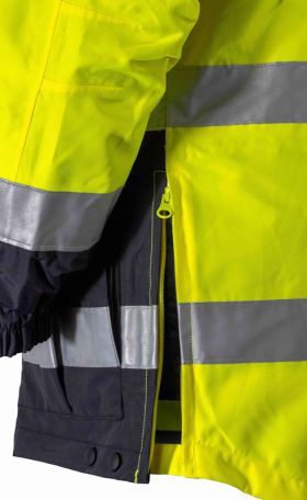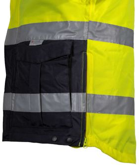 The STEVRIN - All-Season Jacket is a versatile jacket that is perfect for all types of weather. The outer shell is made of a durable, water-resistant fabric that will keep you dry in light rain or snow. The inner quilted jacket can be zipped out for a more casual look or zipped in for extra warmth. This jacket features ANSI Class 3 visibility and 3M Scotchlite™ striping for maximum visibility. The jacket has a relaxed fit that allows for layering and a comfortable hood that can be adjusted to fit snugly. It also has two hand pockets and one chest pocket for storing essentials.