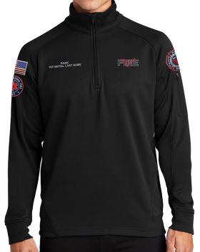 Cool, dry, and colorfast, this quarter-zip pullover has a pill-resistant, snag-resistant face with a matte finish and brushed backing for comfort. It features double-knit construction, as well as a zippered pocket on the left sleeve and a chin guard.