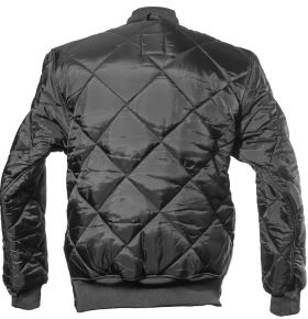 - 100% polyester rib knit collar, cuff, and bottom band (back only)