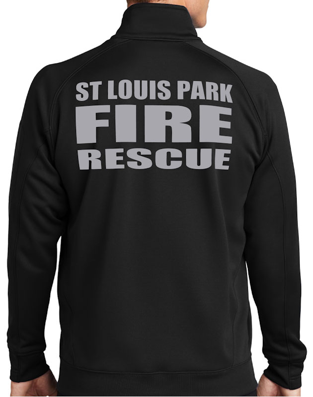 Back: 3M Scotchlite. Line 1 = ST LOUIS PARK Line 2 = FIRE Line 3 = RESCUE